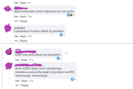Një qytetar ka kërkuar që ambasadori amerikan të shpallet “Persona Non Grata”. Një tjetër e ka quajtur “Fundrrinë”. Të tjerë komentues kanë përdorur gjuhë edhe më të papërshtatshme për të cilën nuk duam të raportojmë.