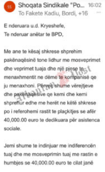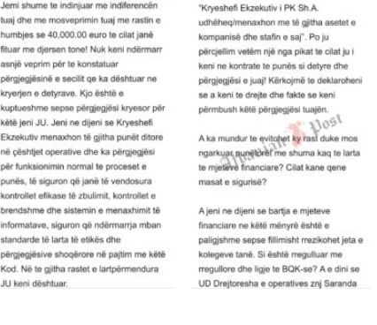 “Me anë të kësaj shkrese shprehim paknaqësinë tonë lidhur me mosveprimet dhe veprimet tuaja dhe një pjese të menaxhmentit në dëm të kompanisë që ju menaxhoni. Përveç shumë vërejtjeve dhe paknaqësive që kemi, dhe kemi shprehur edhe më herët, në këtë shkresë po i referohemi rastit të plaçkitjes së afër 40 mijë eurove të dedikuara për asistenca sociale”.
