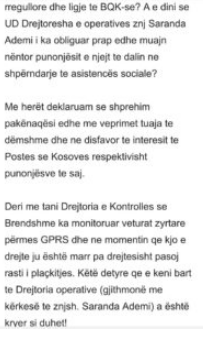 “A e dini se U.D drejtoresha e Operativës znj.Saranda Ademi i ka obliguar parpë edhe muajin nëntor punonjësit e njëjtë të dalin në shpërndarje të asistencës sociale”.