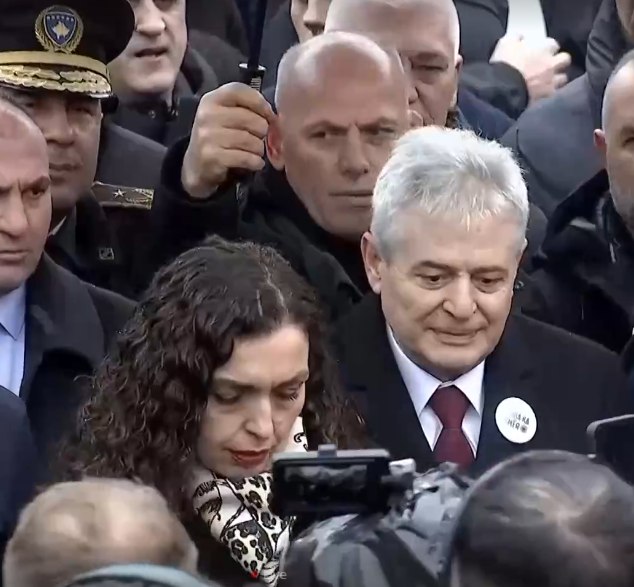Presidentja e Kosovës Vjosa Osmani pas përfundimit të ceremonisë së parakalimit për nder të pavarësisë së Kosovës, ajo i’u ka bashkangjitur protestës kundër gjykimit të ish krerëve të UÇK-së.
