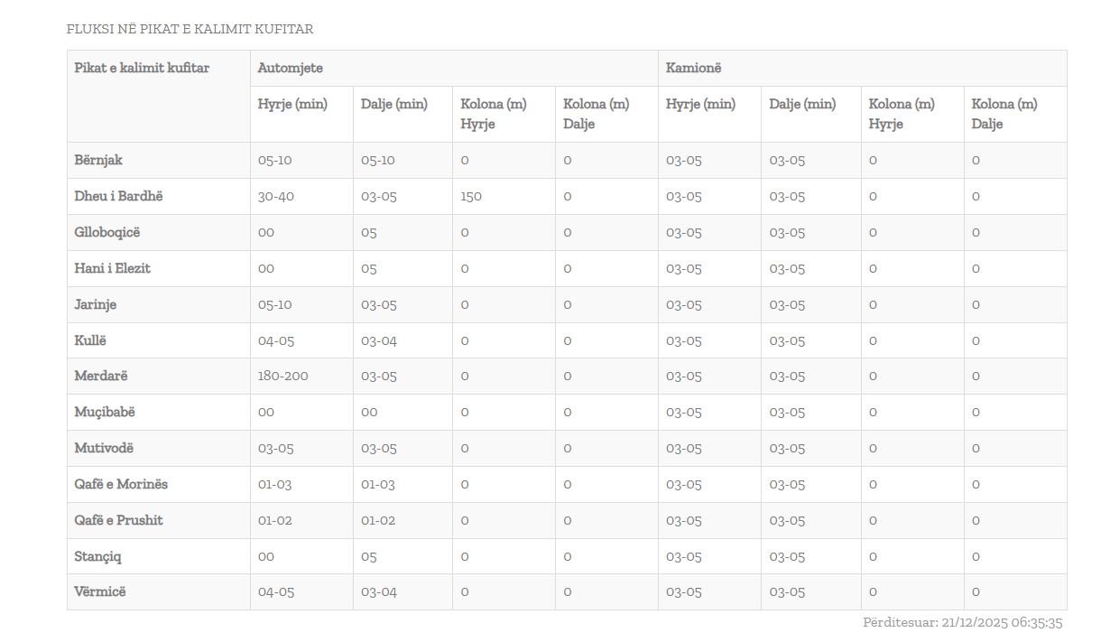 Sipas të dhënave të Qendrës Kombëtare për Menaxhim Kufitar, pritjet për hyrje në pikën kufitare të Merdarës arrijnë nga 180 deri në 200 minuta, ndërsa fluks i shtuar raportohet edhe në pikën kufitare të Dheut të Bardhë, ku pritjet variojnë nga 30 deri në 40 minuta.