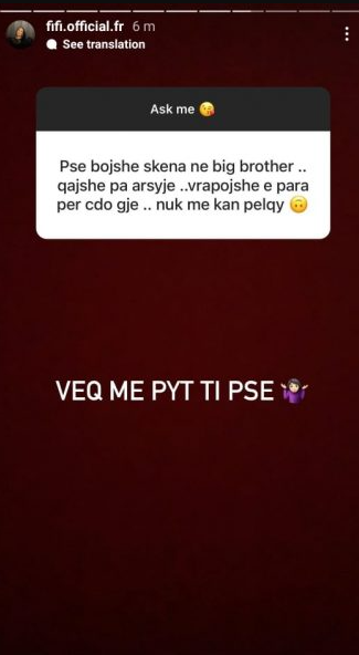 Fifi ka qenë këngëtarja nga Kosova e cila ka qenë pjesë e shtëpisë së Big Brother VIP, dhe deri sa ka qenë prezentë aty brenda ka bërë mjaft materiale për mediat rozë.
