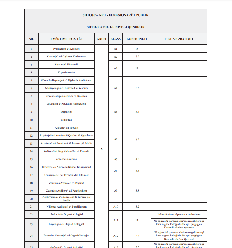 Koeficientin më të lartë, siç shihet, do ta ketë presidentja e Kosovës me 18.0
