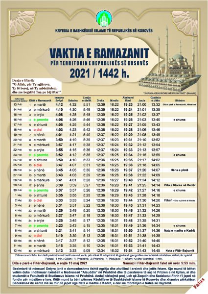 Në njoftimin e Bashkësisë Islame të Kosovës bëhet e ditur se muaji i Ramazanit do të fillojë më 12 prill dhe do të përfundojë më 13 maj.