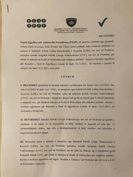 Nga PZAP kanë pranuar këtë ankesë dhe i kanë shqiptuar VV-së gjobë prej 5 mijë e 100 euro të cilën thuhet se ky subjekt politik detyrohet ta paguaj brenda 15 ditësh.