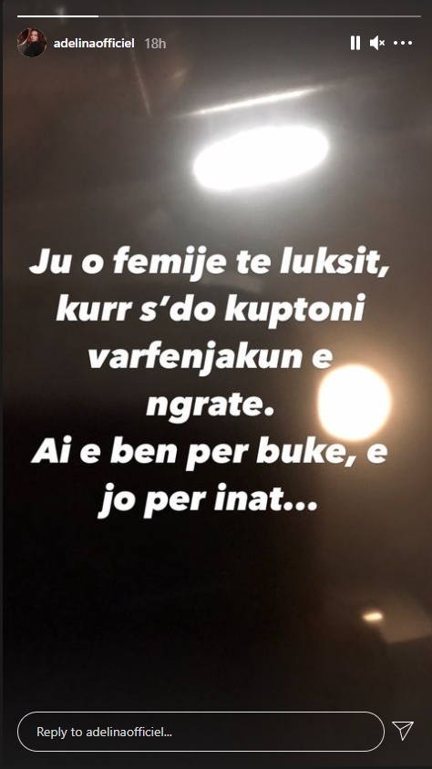 Së fundmi, Adelina ka publikuar një shkrim në InstaStory, me anë të së cilit iu është drejtuar fëmijëve të familjeve të pasura.