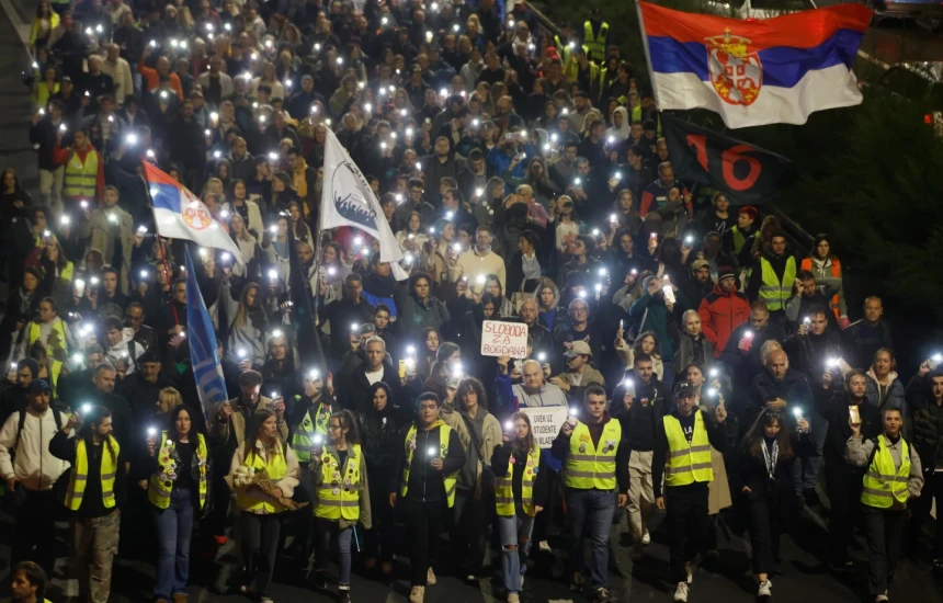 Me dritat e telefonave përpjetë, protestuesit në Beograd ecën në heshtje për të nderuar viktimat. Turma të mëdha u mblodhën edhe në Novi Sad mes shiut të dendur në qytet.