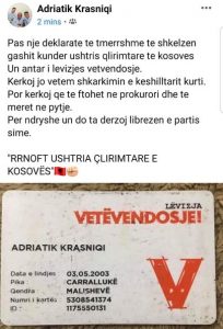 Adriatik Krasniqi, nipi i ish-kandidatit të VV’së për deputet, njëherit ish-ushtar i UÇK’së, Gani Krasniqi, ka thënë se do të dorëzojë librezën e partisë, pas deklaratave skandaloze që i bëri Shkëlzen Gashi, këshilltari i Kryeministrit në detyrë, Albin Kurti.