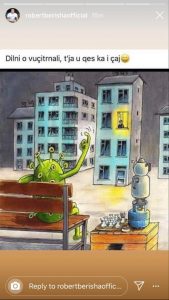 Në imazh ulur shihet se është “koronavirusi” ndërsa afër vetës ka çajnikun, e në katin e tretë të një banese ndodhet “vushtrriasi”, por për shkak të pandemisë, ai nuk mund të dal jashtë për të pirë çaj.