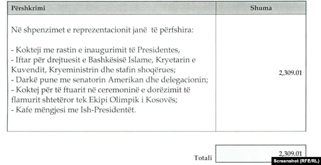 Në anën tjetër, sipas të dhënave zyrtare, që nga marrja e mandatit e deri më 25 gusht, presidentja Vjosa Osmani ka harxhuar 2.300 euro për reprezentacion.