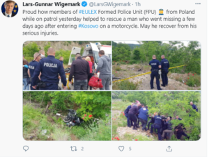 “Krenar sesi anëtarët e EULEX nga Njësia e Policisë nga Polonia dje ndihmuan për ta shpëtuar një burrë që u zhduk disa ditë më parë pasi hyri në Kosovë me një motoçikletë. Shërim të shpejtë atij nga lëndimet e rënda”, shkroi shefi i EULEX-it në Twitter.