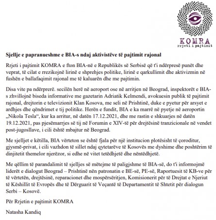 Rrjeti i pajtimit KOMRA ka reaguar pasi Shërbimi Sekret serb (BIA) ka marrë në pyetje gazetarin Adriatik Kelmendi i cili ishte pjesëmarrës në Forumin e XIV-të për drejtësinë tranzicionale në vendet post-jugosllave në Beograd.