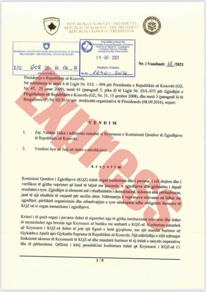 “Znj. Valdete Daka i ndërpritet mandati si Kryesuese e Komisionit Qendror të Zgjedhjeve të Republikës së Kosovës. 2. Vendimi hyn në fuqi në datën e nënshkrimit”, thuhet në vendim.
