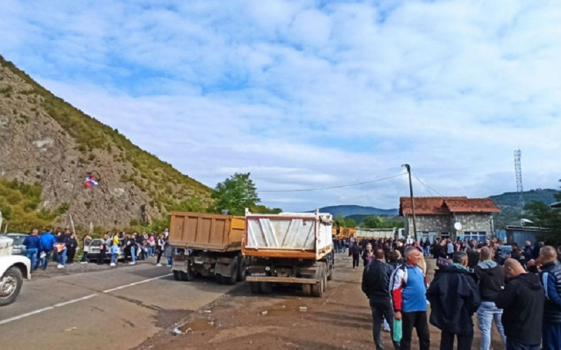 Ata kanë “përforcuar” pengesat e tyre me tre kamionë të tjerë të mbushur me zhavorr, duke bllokuar edhe më shumë qarkullimin në atë pjesë.