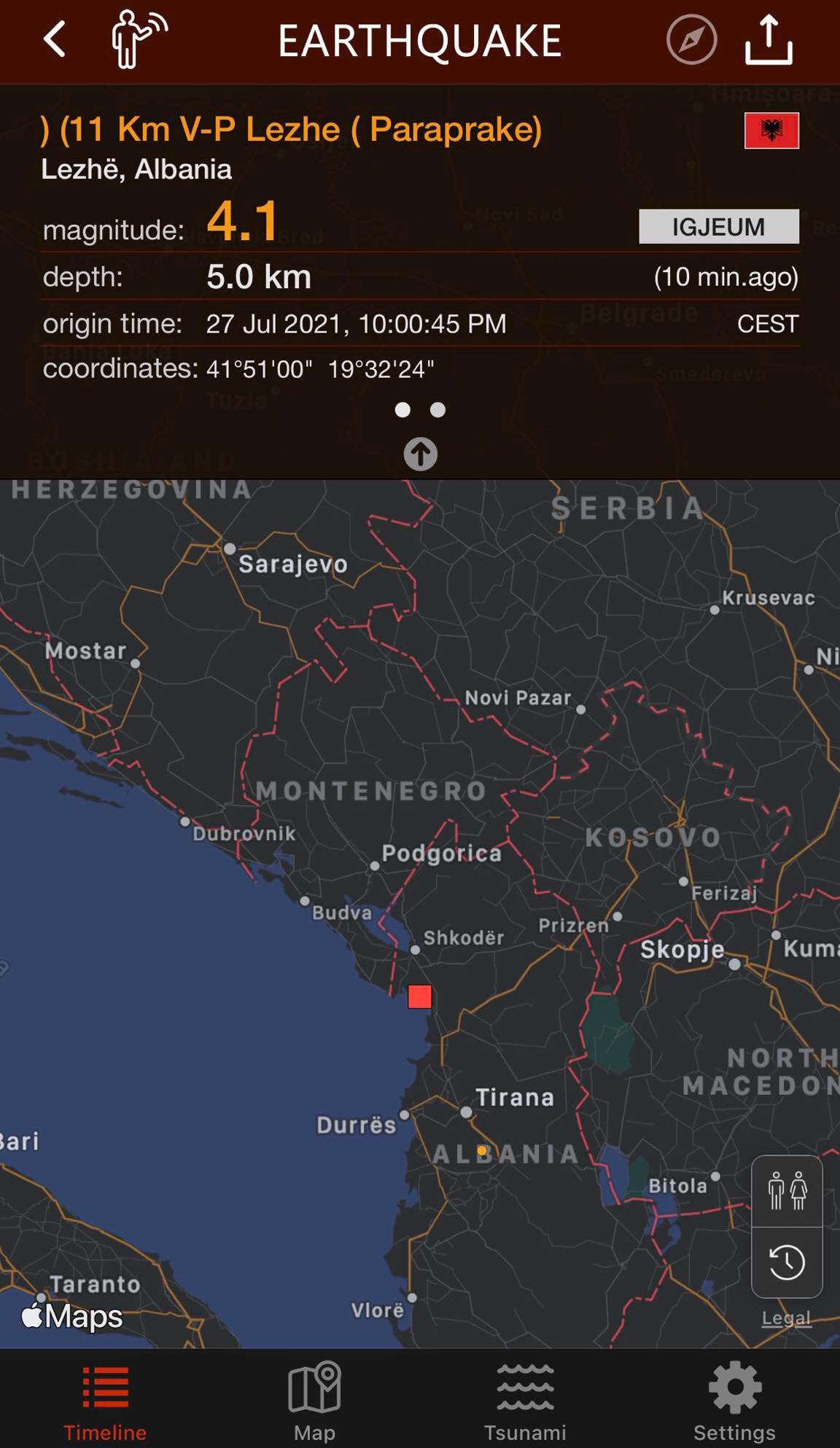 Tërmeti me magnitutë 4.1 ballë i shkallës Rihter është ndjerë në qytetin e Lezhës.