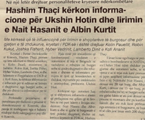 “Fjala është për absurditetin që karakterizojnë vendimet e autoriteteteve të reja të Beogradit në vazhdimin e mbajtjes në burgjet serbe të qindra shqiptarëve dhe refuzimin e dhënies së informative për mijëra të tjerë që konsiderohen të zhdukur, vecanërisht intelektualin e mirënjohur Ukshin Hoti”, kishte shkruar Thaçi më 2001.