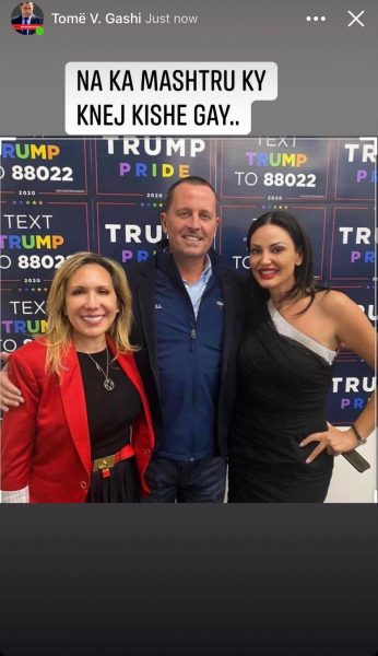 Avokati Tomë Gashi, ka bërë një deklaratë të pamatur në profilin e tij në Facebook Story, ai ka shpërndarë një fotografi të Richard Grenell në shoqëri të këngëtares shqipatare Bleona Qerretit, në përshkrimin e së cilës ka shkruar “na ka mashtruar ky knej kishe gay”.