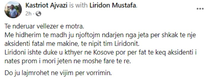 Liridoni ishte duke u kthyer ne Kosove por per fat te keq aksidenti i nates i ndodhur ne Hungari, i mori jeten ne moshe fare te re.