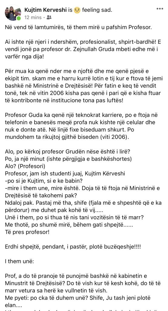 Për mua ka qenë nder me e njoftë dhe me qenë pjesë e ekipit tim. skam me e harru kurrë lotin e tij kur e ftova të jemi bashkë në Ministrinë e Drejtësisë! Për fatin e keq të vendit tonë, tek në vitin 2006 kisha pas qenë i pari që e kisha ftuar të kontribonte në institucione tona pas luftës!
