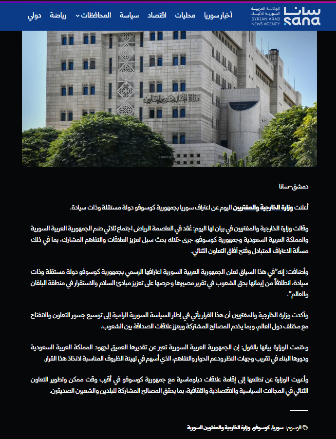Ministria e Punëve të Jashtme dhe të Emigrantëve ka njoftuar për njohjen nga Siria të Republikës së Kosovës si shtet i pavarur dhe sovran.