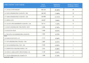 Nga certifikimi del se VV ka fituar 50,28%, PDK 17,009%, LDK, 12,731%, AAK 7,124, Srpska Lista 5,094%.
